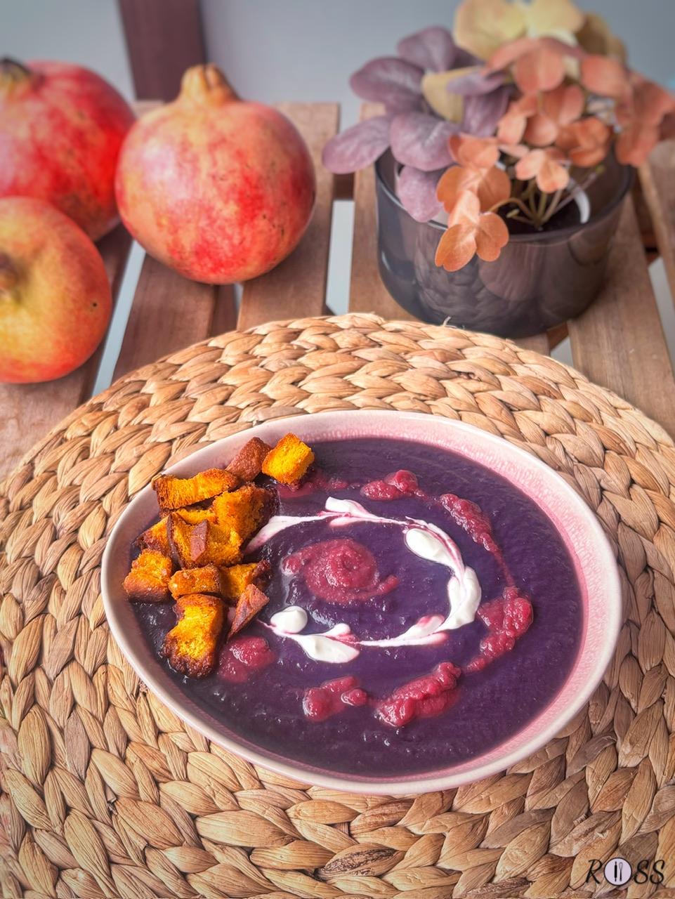1. Trita lo scalogno finemente e soffriggilo in pentola con olio d'oliva e rosmarino. Nel frattempo taglia a fette il cavolo viola e le patate a cubetti e uniscile al soffritto. Aggiungi il brodo e lascia cuocere con coperchio. Quasi a fine cottura, unisci i ceci. A cottura ultimata crea una vellutata con un minipimer. Preleva dal totale una piccola quantità a cui aggiungerai il succo di limone, in questo modo il colore viola schiarisce ed otterrai l'effetto bicolore e per la crema bianca ti basta unire al formaggio qualche goccia di acqua e mescolare. Impiatta e decora con la vellutata al limone, il formaggio e i crostini di pane ( io ho utilizzato i resti del mio pane alla zucca)